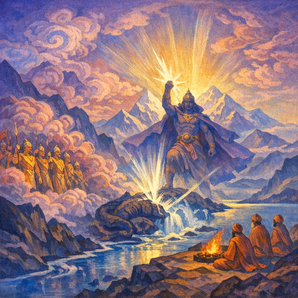 RV 1.165 is a dramatic Indra–Marut dialogue framed as praise: the poet questions the Maruts’ unified splendor and power, while Indra asserts his independent victory over Vṛtra and his benefactions to humanity. The hymn negotiates divine precedence and alliance—how storm-gods and the thunderer act together—ending with an invitation for the Maruts to come with their “host” of force and grant vigor, protection, and increase.