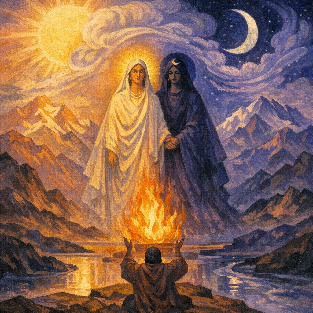 O Heaven and Earth, young sisters moving together in one accord, kin within the Father’s lap, breathing toward the navel of the world—guard us from the vast hostile Power that would break the harmony of our becoming.