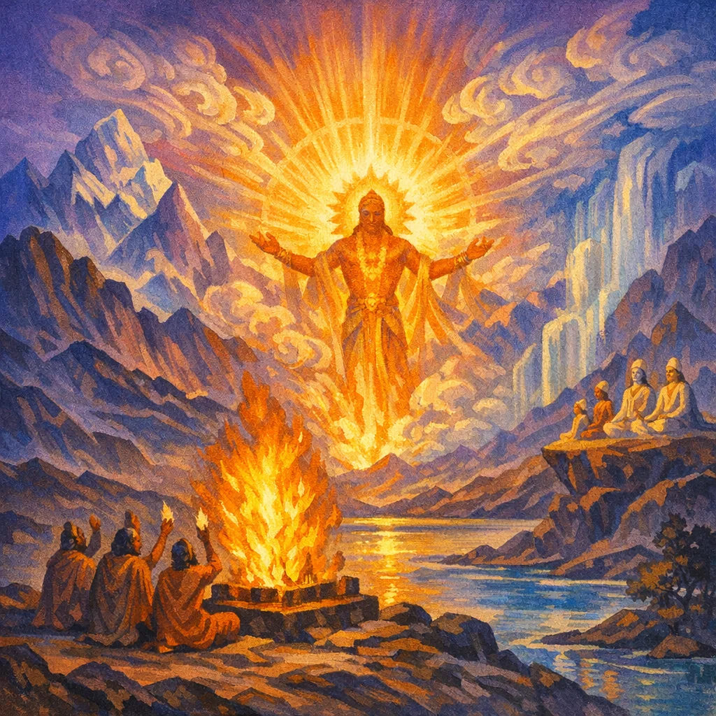 This hymn is an invitational litany that calls Savitṛ in his Viśvānara (“all-pervading, all-in-man”) aspect to enter the sacrifice with the illumined streams of offering and to widen the worshipper’s inspired will to embrace the whole moving world. As the praise unfolds, allied deities—especially Tvaṣṭṛ and Indra Vṛtrahan—are invoked to join in a shared “abhipitva” (intimate dwelling/communion), granting vigor, settled stability, and enduring riches. The hymn culminates in the image of dīdhiti (bright kindling/inner illumination) as the sustaining presence through which the seeker labors among the gods and comes to know the strong host of boons.