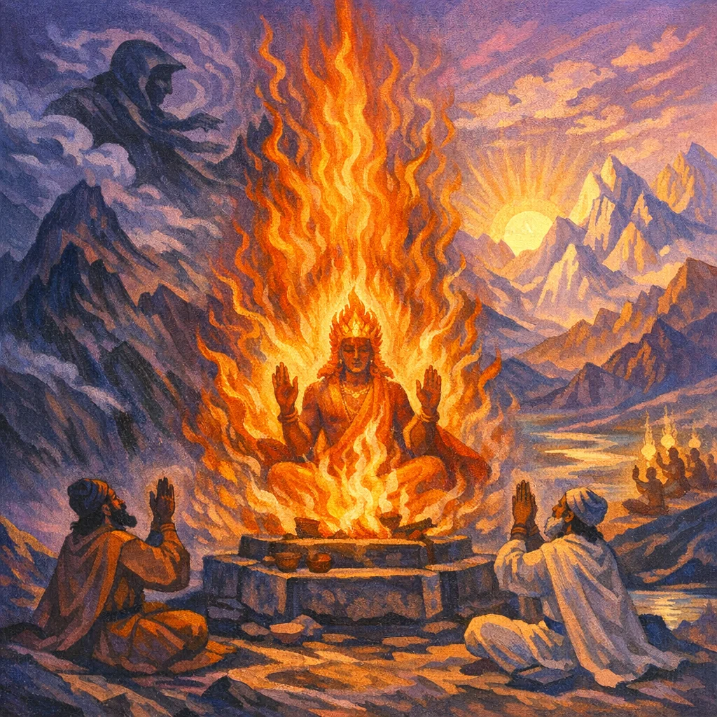 This hymn is a prayer to Agni as the wise guide who leads the worshipper on the “good path” toward prosperity and right being, while removing recurring sin and inner error. It also asks Agni to protect the community from hostile, ill-willed forces and concludes with a confident offering of well-formed speech to the mighty “son of Mind,” seeking lasting abundance and victorious strength.