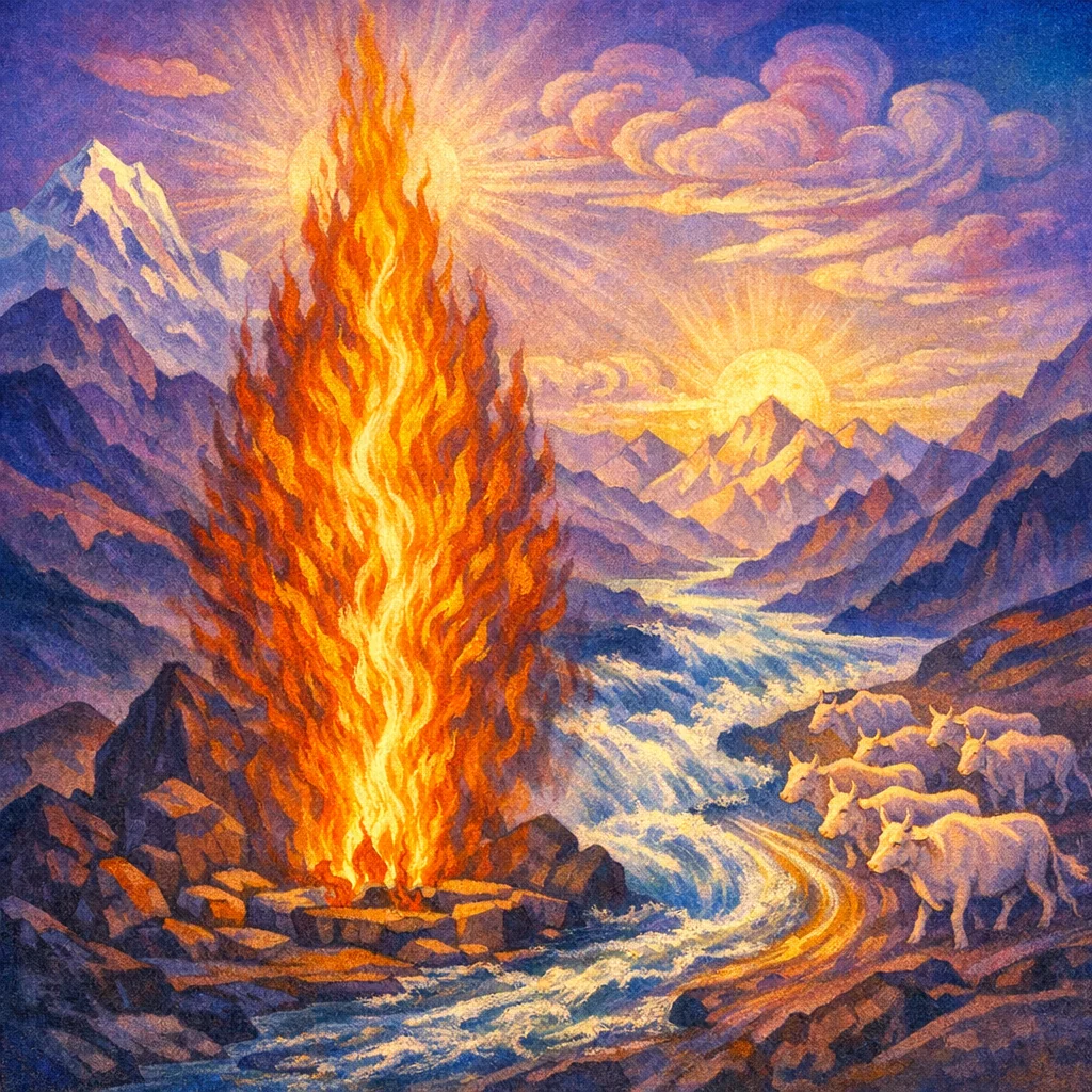 The sun image points to Agni’s illuminating knowledge, while breath points to his role as life-force and steady inner presence that renews energy and clarity.