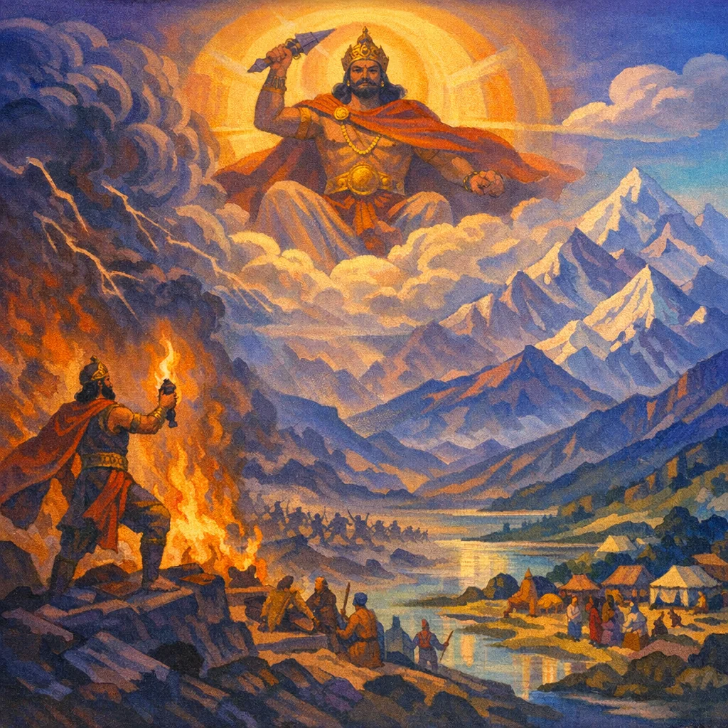 RV 1.81 is a praise-hymn to Indra as the ever-growing power who wins battles, upholds the worlds, and protects his worshippers in great and small crises alike. It magnifies Indra’s unrivaled might—filling earth and spanning heaven—while also asking for practical aid: victory, protection, and discernment regarding hostile or non-offering people.