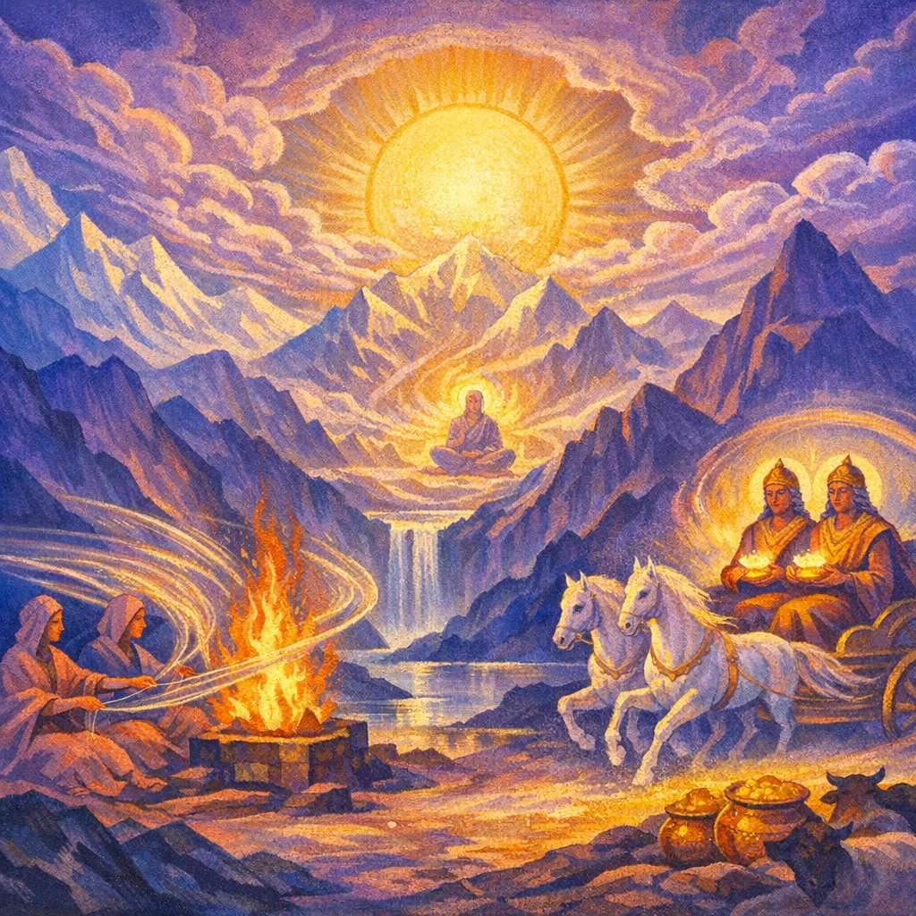 O mighty Ashvins, you churn the resisting knots of the being as a strong tool breaks what is hard; in our aims you make the passage. Like the Ribhus’ skill you arrive with rugged force; like the Wind you drive away the wasting that diminishes our plenitudes of force (rayi), so that our inner riches do not decline.