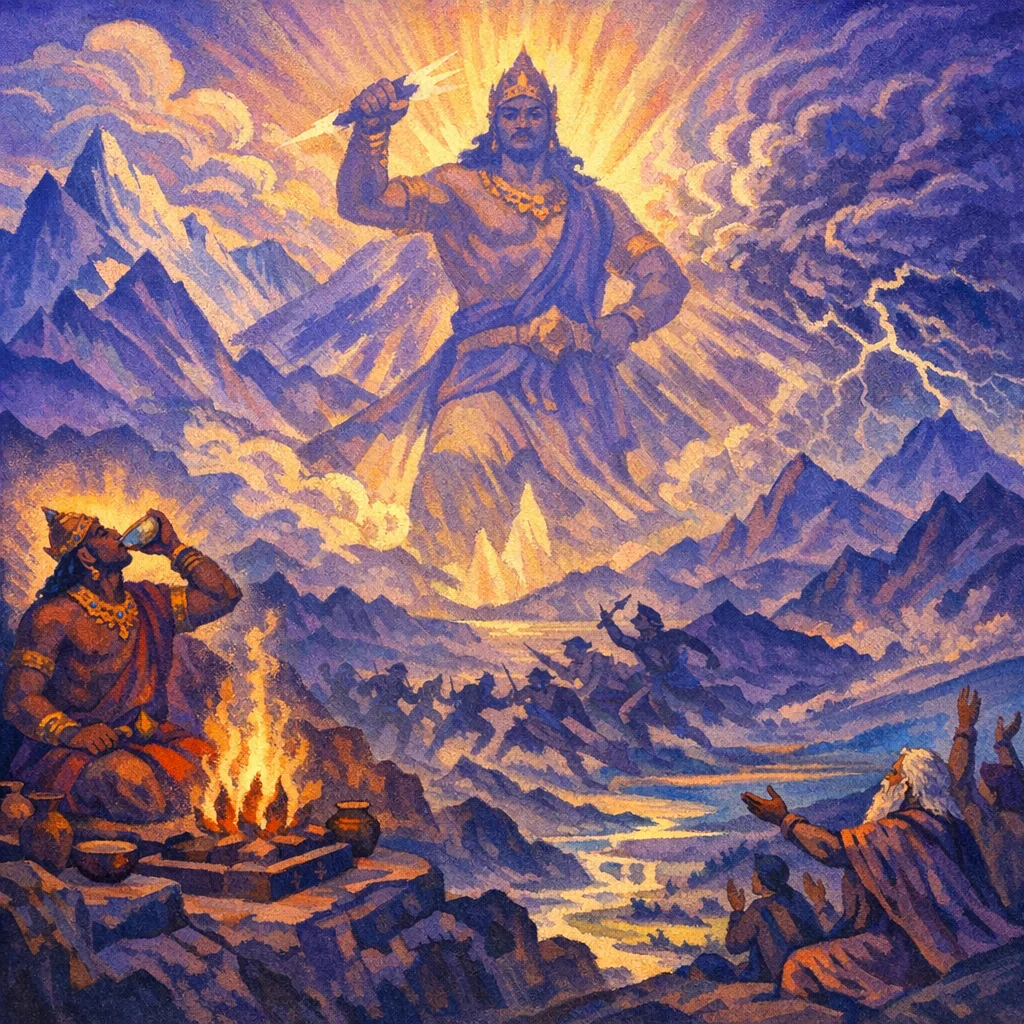 This hymn is a morning Soma-invocation to Indra, urging him to drink the pressed Soma as his “first draught” and to rouse his victorious energy against hostile forces. It praises Indra’s ancient, rightful claim to the Soma-vessel, celebrates the gods’ shared desire for the honeyed drink, and ends with a plea that Indra look upon the striving worshippers, grant triumph in battle, and apportion wealth even from what seems unallotted.