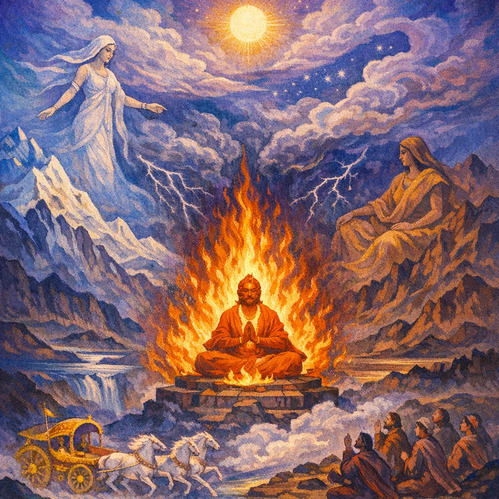 Agni (as Hotṛ) with cosmic frame Dyāvā-Pṛthivī (Heaven and Earth)