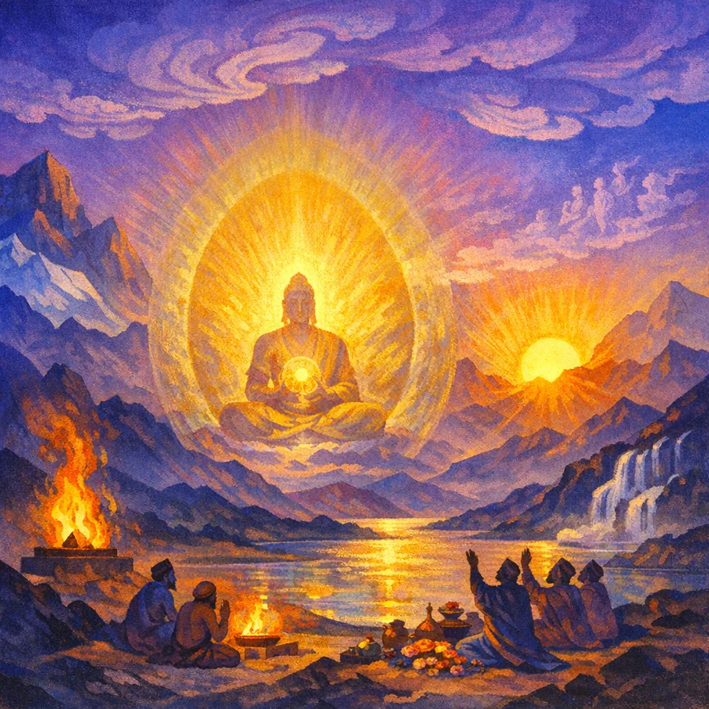 Hiraṇyagarbha means “Golden Germ/Embryo,” an image for the first seed of creation—radiant, life-bearing, and prior to the formed worlds. It signifies the primordial origin from which heaven, earth, and all beings arise and by which they are upheld.