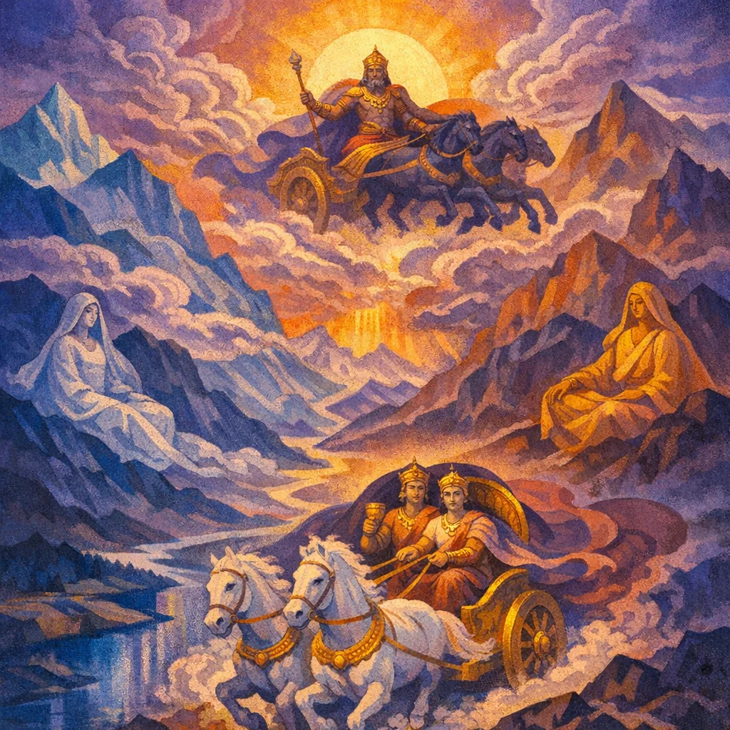 The hymn briefly highlights cosmic and moral order: Varuṇa represents sovereign ṛta and the ending of wrongdoing, complementing the Ashvins’ practical rescue and aid.