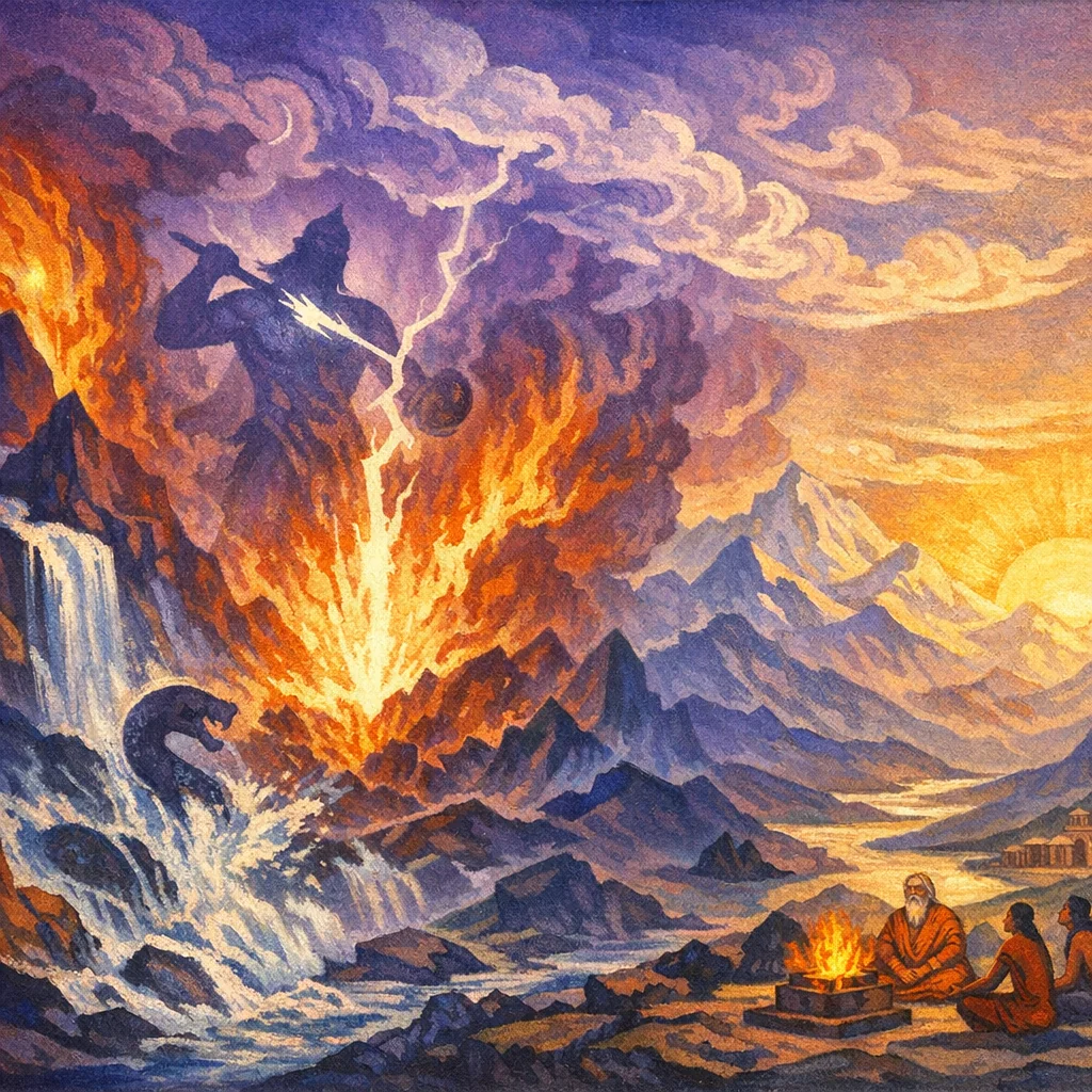 On the cosmic level it recalls Indra breaking Vṛtra’s obstruction so waters can flow; inwardly it points to breaking inner blocks so energy, clarity, and inspiration can move freely.