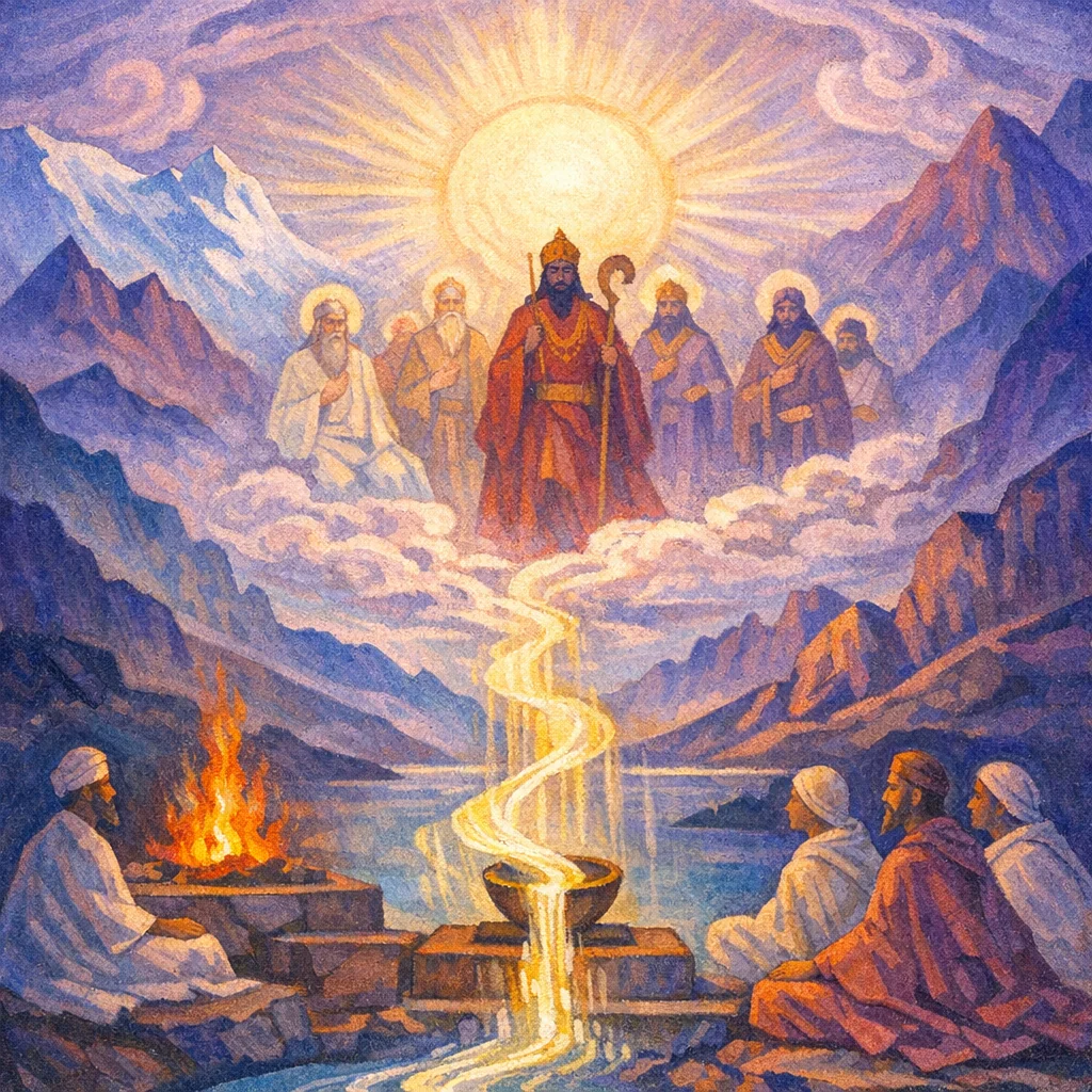It points to ṛṣis/kavis who protect and uphold the light of truth (symbolized by the Sun). The hymn asks that the departed join this luminous, tapas-born company.