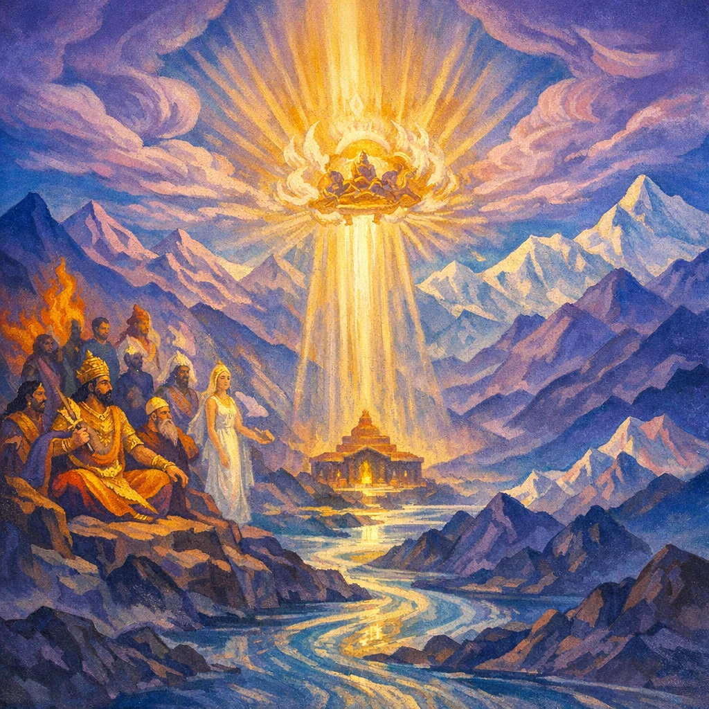 This short hymn invokes Indra together with the Viśve Devāḥ to “set the worlds in right order,” establishing harmony across the planes of existence and human life. It asks that Indra, accompanied by the Ādityas and Maruts, become a protector of our embodied vitality, and it culminates in an inward turning of the sacred ray-song (arká) that restores svadhā—one’s innate law and sustaining power.