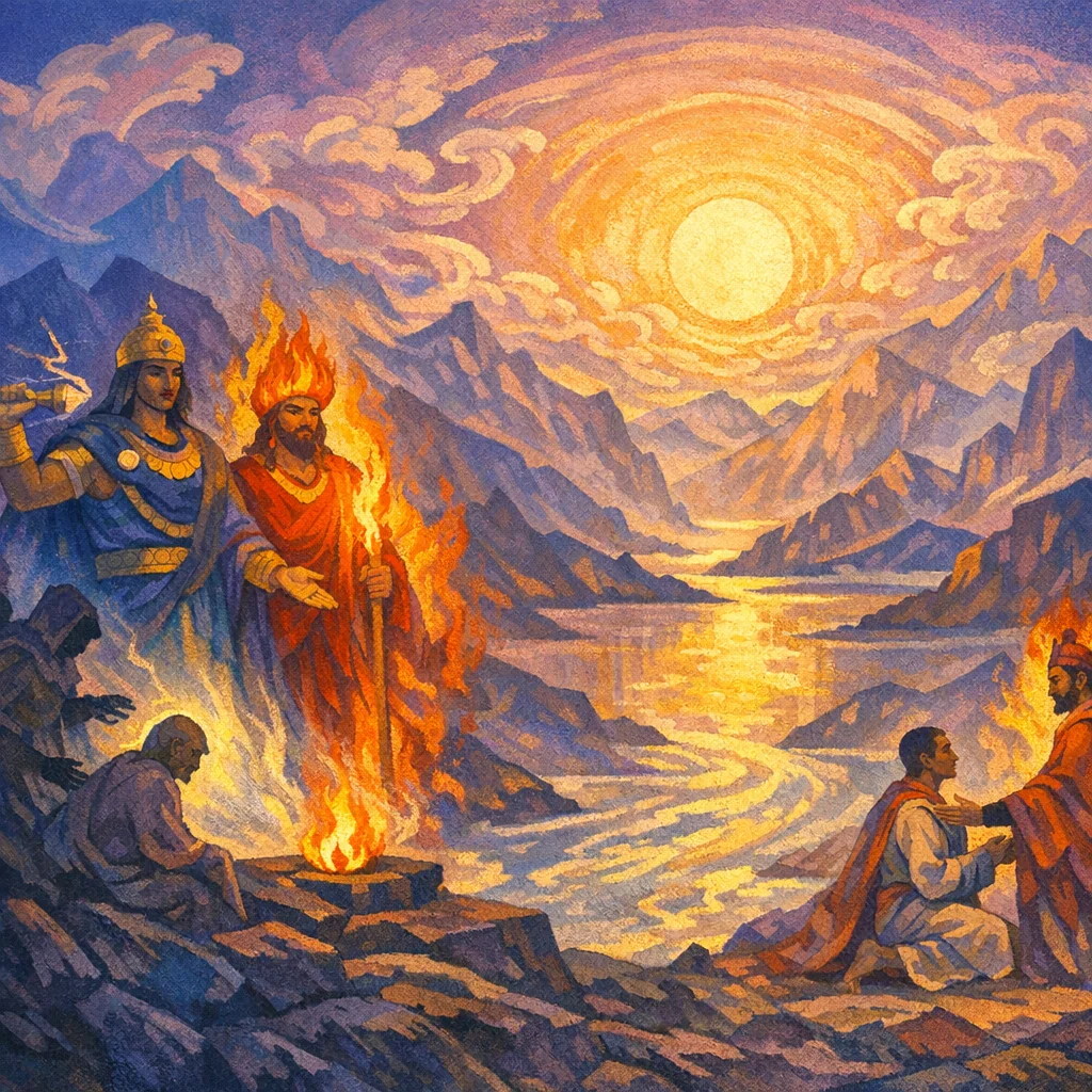Indra represents the power that breaks obstruction and leads beyond danger, while Agni represents the purifying fire that carries the offering and the prayer. Together they act as a united force for release and restoration.