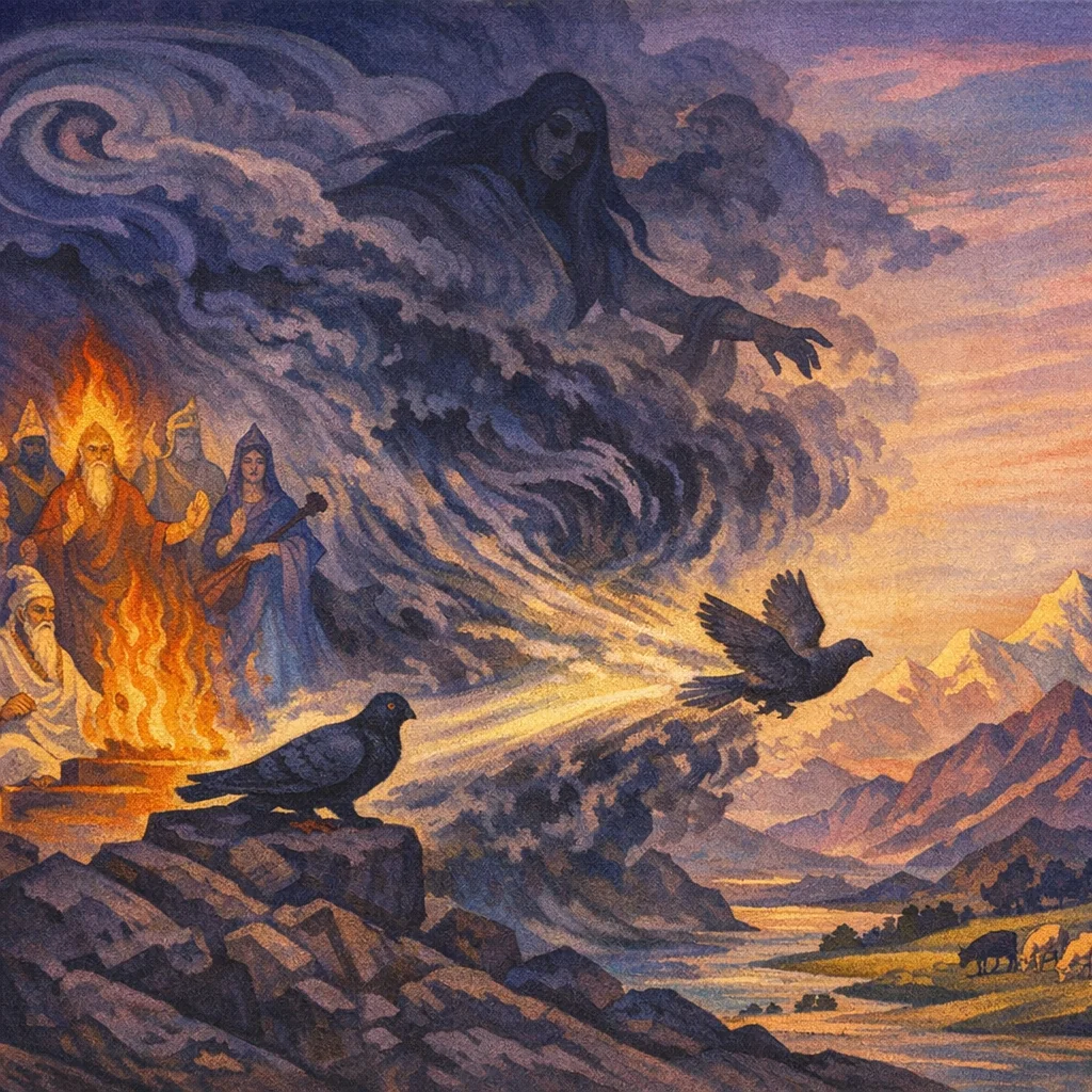In this sukta the pigeon is treated as a possible bad omen—an apparent ‘messenger’ of Nirr̥ti (misfortune). The hymn uses mantra to send that omen away and restore peace.