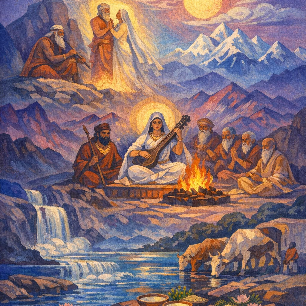 On the open track of the paths Pūṣan is born into activity—on the track of heaven, on the track of earth. Knowing the way, he moves both toward and beyond, embracing the two most dear seats of existence, guiding the soul’s journey between the heights and the foundation.