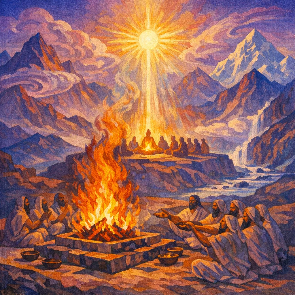 This brief hymn links the kindling of Agni with the kindling of concord among people: as fire is brought to fullness by gathered fuel, so a community is strengthened by gathered intention. It prays for shared speech, shared mind, and shared rite, presenting yajña as the practical means to form “one consciousness” in the many.