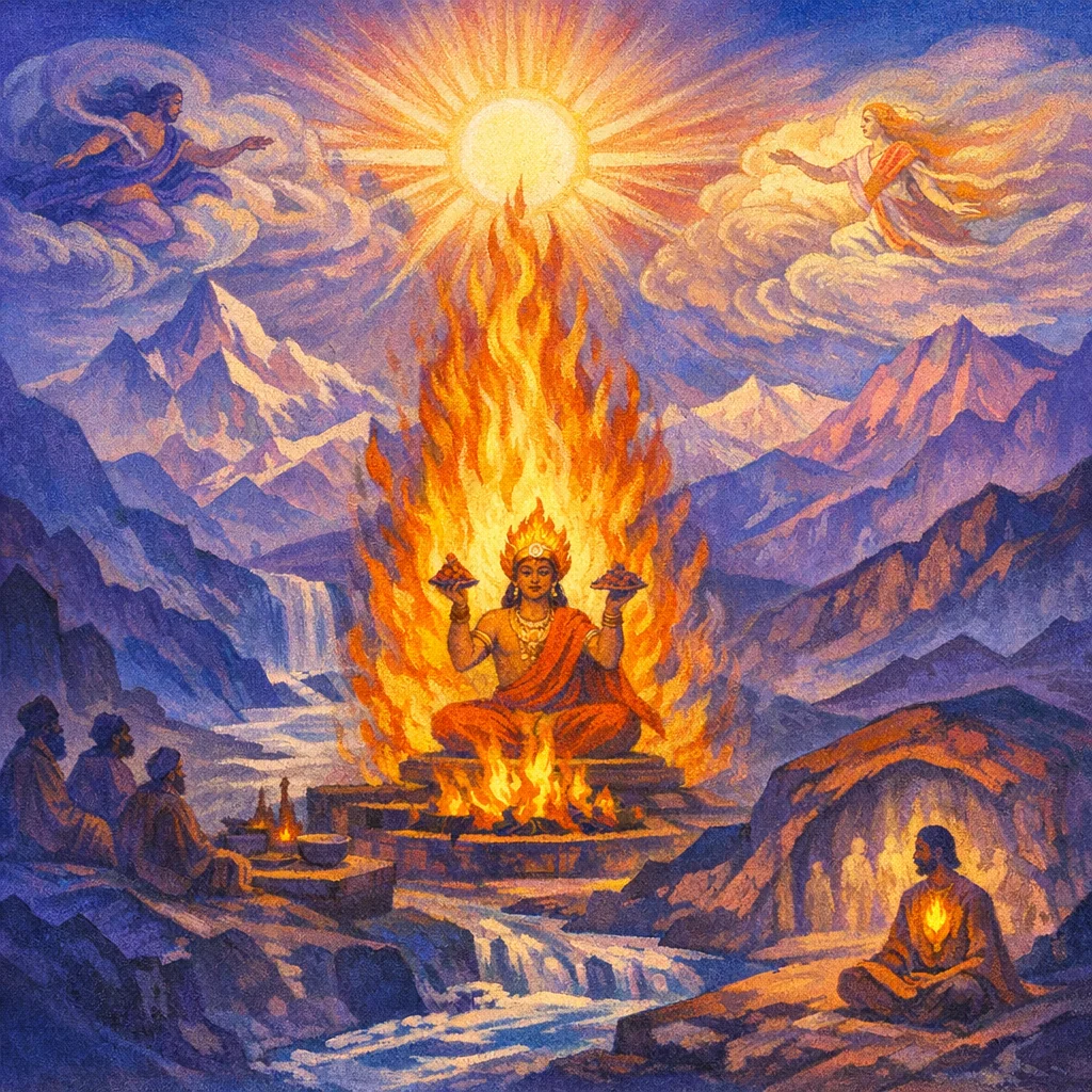 O Agni, whom Heaven and Earth brought forth, whom the Waters and Tvaṣṭṛ fashioned, whom the power of a happy birth has generated—knowing the path that leads along the way of the Fathers, blaze forth, kindled, with luminous radiance within us.