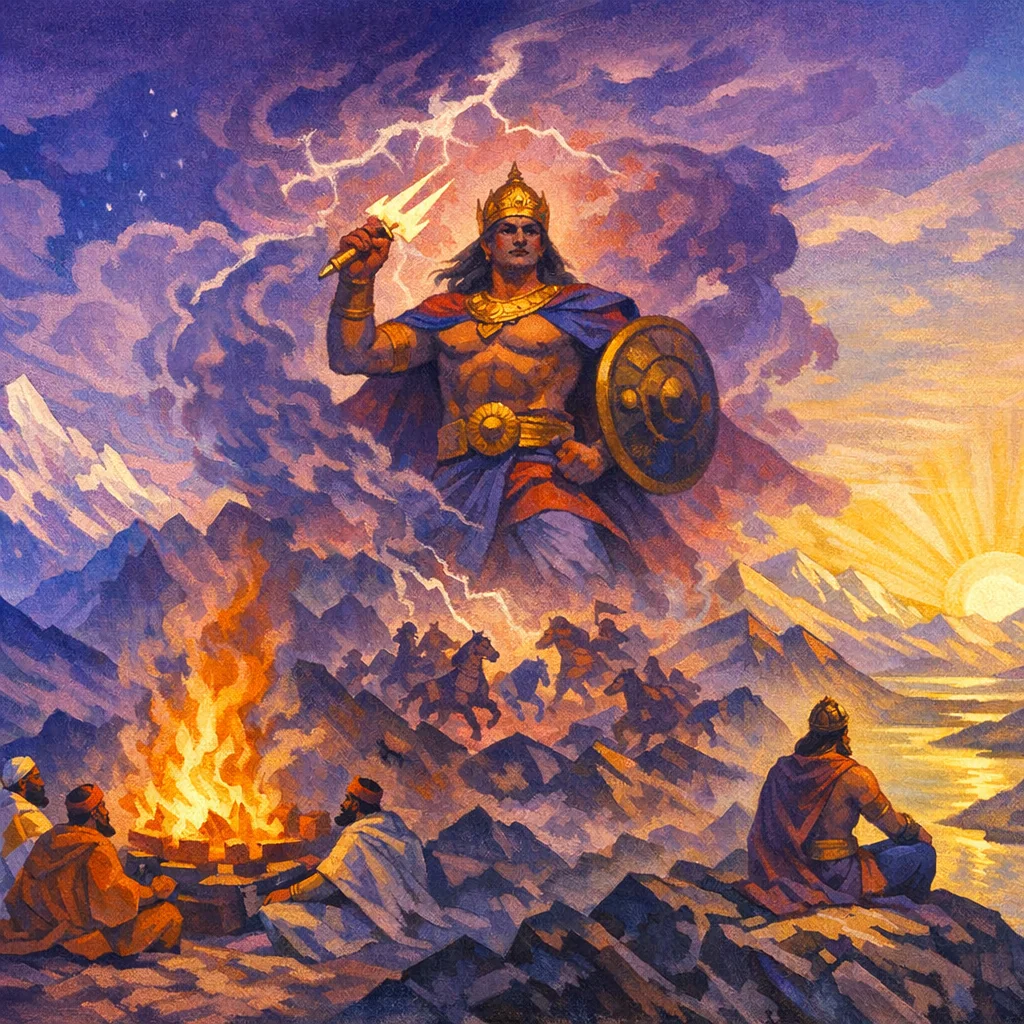 This hymn praises Indra as the ever-effective ally who is awakened by a “pure” stoma (hymn) and who, across many nights and days, acts like the hotṛ for human communities—summoning light through obscurity. It emphasizes reciprocity: inspired speech and offerings nourish one another, and Indra’s own-force spreads and orders the battles, standing firm like a chariot in the midst of conflict while being propelled by bhadrā sumati (auspicious right-mindedness). Overall, the sukta seeks Indra’s companionship, victory, and inner clarity for the worshipper amid struggle.