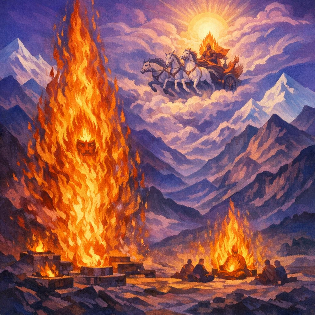 The hymn describes Agni’s light as wide and far-reaching, and it links the fire with awareness (cikit)—the capacity to notice, understand, and act rightly.