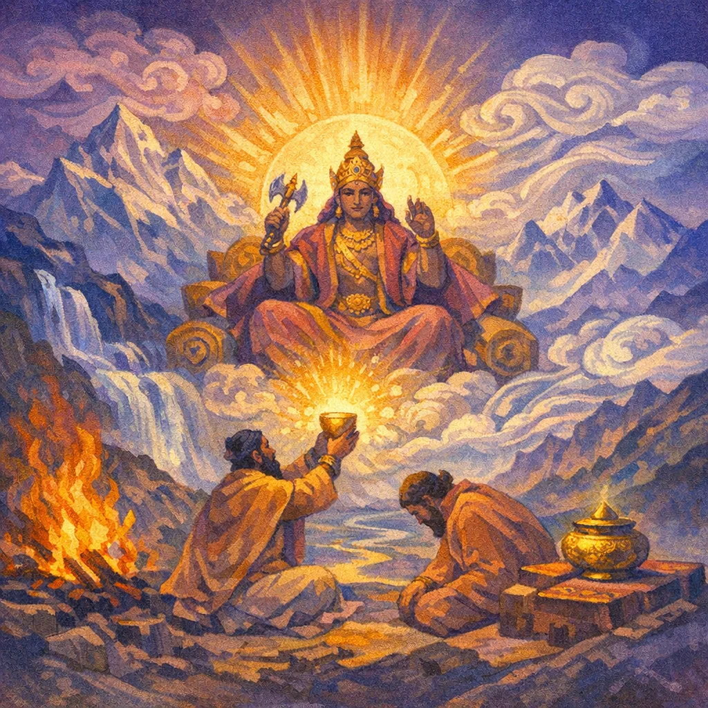 RV 10.32 is a late-book Indra hymn that invites the bountiful Maghavan to take his seat at the Soma-pressing, awaken to the pressed essence, and bestow “both”—the offering’s acceptance and the prosperity it yields. Moving through images of a god-seeking path, protective powers, and honeyed abundance, it culminates in a vow to complete auspicious ritual works and to hold Soma inwardly “in the heart,” joining outer sacrifice with inner devotion.