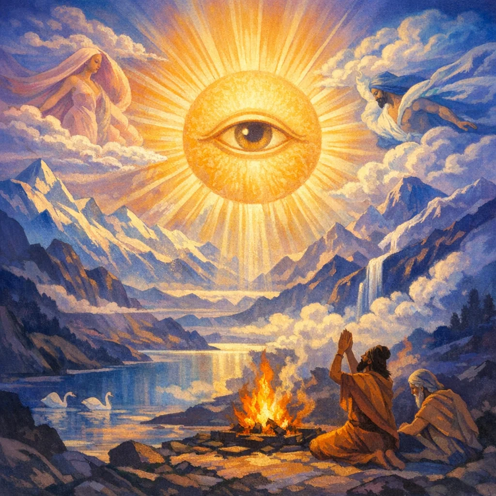This hymn venerates Sūrya as the far-seeing “Eye” of Mitra–Varuṇa, upholder of ṛta (truth-order), whose rising reveals, measures, and safeguards the worlds. It prays for clear vision, well-being, and protection from hostility, and includes a penitential note that faults committed by speech or mind be removed and redirected away from the worshipper.