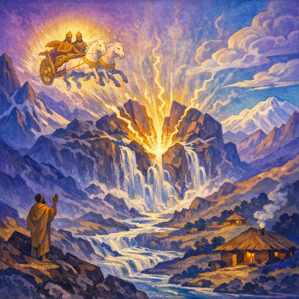The Aśvinau are twin Vedic deities who arrive at dawn in a radiant chariot. They are praised as swift helpers, healers, and protectors who respond quickly to human prayers.