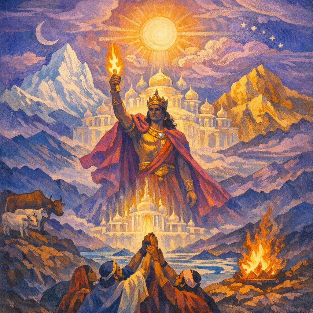 We have grasped your right hand, O Indra—O lord of treasures, we who seek the riches of being. For we know you as the strong guardian of the Rays (cows). Give to us a varied, virile plenitude (rayi), a wealth that is force and light.