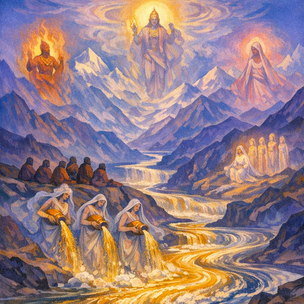 They represent the divine Waters as living, maternal powers that sustain life. In Vedic imagery, their flowing abundance is like ghee-rich, honey-sweet nourishment that increases strength and well-being.