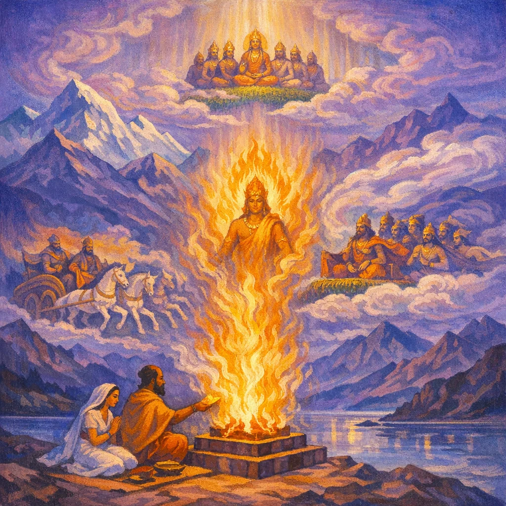This Triṣṭubh hymn opens by kindling Agni and placing the ghee-bright offering upon the seat of Ilā, asking the fire to rise on Earth as the force of right intelligence that carries worship upward. It then widens into a threshold-liturgical vision—Dawn and Night are invoked to seat the gods in the ordered “womb” of the rite—culminating in Agni’s role as summoner who brings Varuṇa, Indra, the Maruts, and the All-Gods to the sacrificial seat for inner and outer fulfillment.