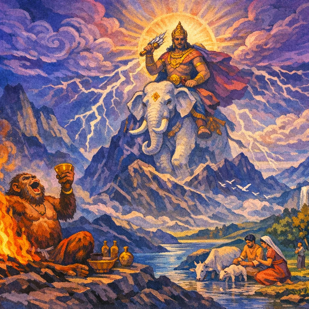 RV 10.86 is a vivid dialogue-hymn centered on Indra and the enigmatic Vṛṣākapi, with Indrāṇī entering the exchange, framed by repeated praise that “Indra is higher than all.” Beneath its humorous, domestic tone, the hymn probes rivalry, loyalty, and the right channeling of soma-inspired power so that Indra’s sovereign force is affirmed and restored. It also preserves folkloric motifs (fertility, healing, extraordinary birth) as signs of Indra’s capacity to lift beings beyond constraint.