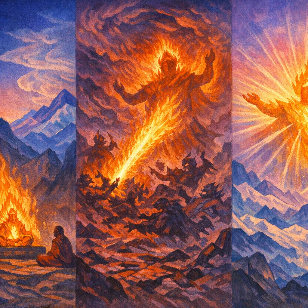 The hymn treats mantra and focused will as a spiritual weapon: inner clarity and disciplined force are directed to break the hidden source of fear, hostility, or harmful influence at its root.
