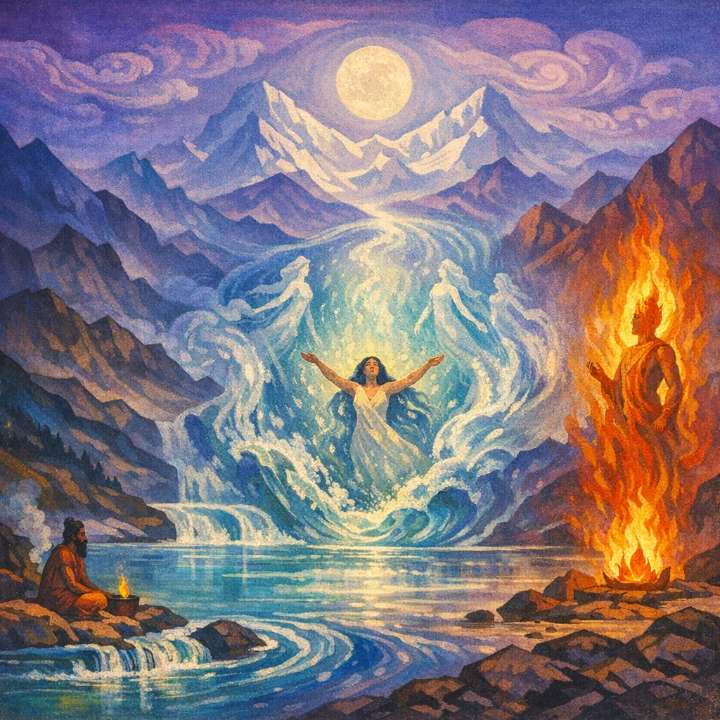 RV 10.9 is a hymn to the Waters (Āpaḥ), praised as sources of delight, nourishment, strength, clear vision, and healing. The poet petitions them for vitality and medicine-like purification, and culminates in a sense of intimate communion with their rasa (essence), drawing Agni into that renewed, luminous state.