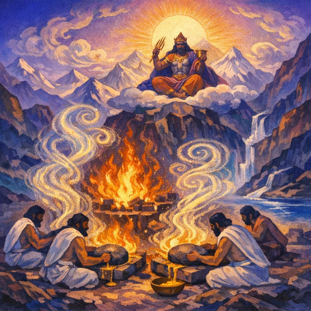 Repeated, disciplined action ‘presses out’ an essence: outwardly the Soma juice, inwardly clarity and inspired thought—released through ordered effort and sacred speech.