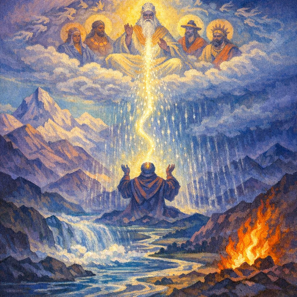 This hymn is a rain-invocation framed as a sacred narrative: Devāpi, acting as priest for King Śaṃtanū, receives empowered speech from Bṛhaspati to unlock the coming of Parjanya’s rains. Bṛhaspati is praised as the master of mantra and divine coordination, able to work through allied deities (Mitra, Varuṇa, Pūṣan, Ādityas, Vasus, Maruts) so that waters, fertility, and communal well-being are restored. The closing movement turns to Agni for protection and for the “plenitude of waters” to be released from ocean and heaven.