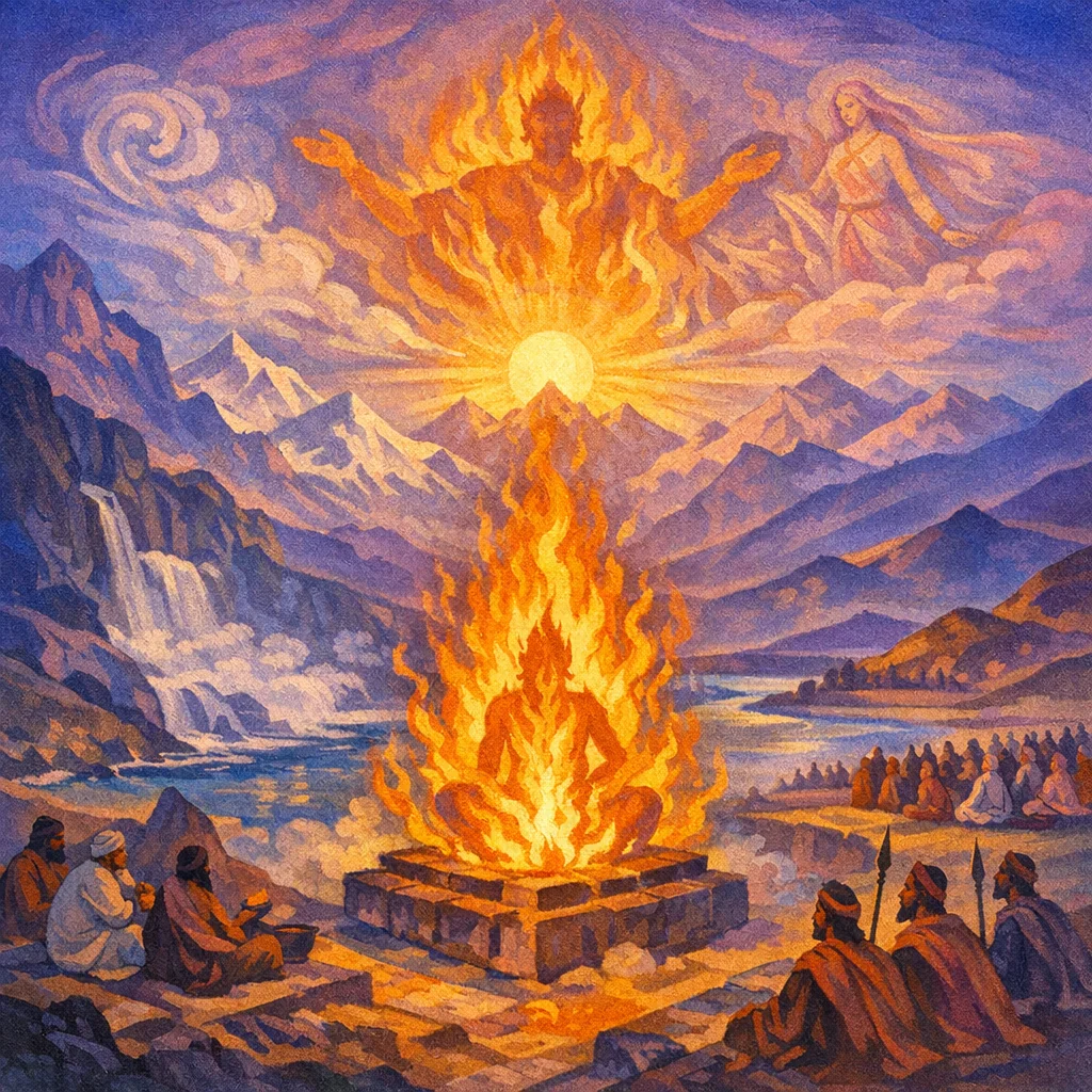 RV 2.1 invokes Agni as the all-born, ever-pure fire who arises from heaven’s brilliance, from waters, stone, wood, and plants, and who is kindled within the human household and heart. The hymn praises Agni’s many relational forms—father, brother, son, and friend—while asking him to lead worshippers and patrons toward prosperity, protection, and a “vast” (bṛhat) utterance in the assembly.