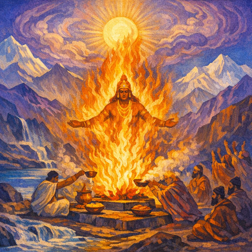 Agni, the much-invoking, is the first—like a father—when he is kindled by men in the place of Iḷā. Wearing the radiance of plenitude, immortal and discerning, he is the purifier who is to be rubbed bright; he is the bringer of victorious force and of worthy fame.