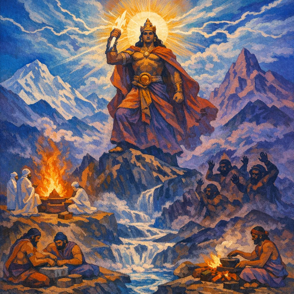 Indra can be read as the awakened will that breaks inner obstacles; when opposing impulses clash within us, the hymn points to a higher strength that restores clarity, courage, and effective action.