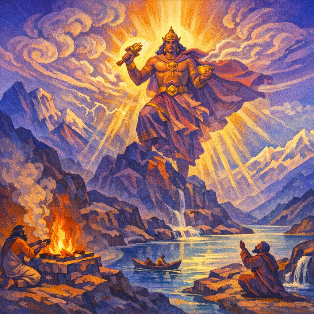 RV 2.16 is a seven-verse Triṣṭubh hymn in which Gṛtsamada offers a carefully “carried” praise like an oblation to the kindled fire, inviting Indra—ancient yet ever-young—to come to the Soma-pressings. The hymn exalts Indra as the daring Bull who receives the peoples’ resolve (kratu) and is urged to drink Soma with radiant strength, so that he may pour wealth and protection upon the worshippers.