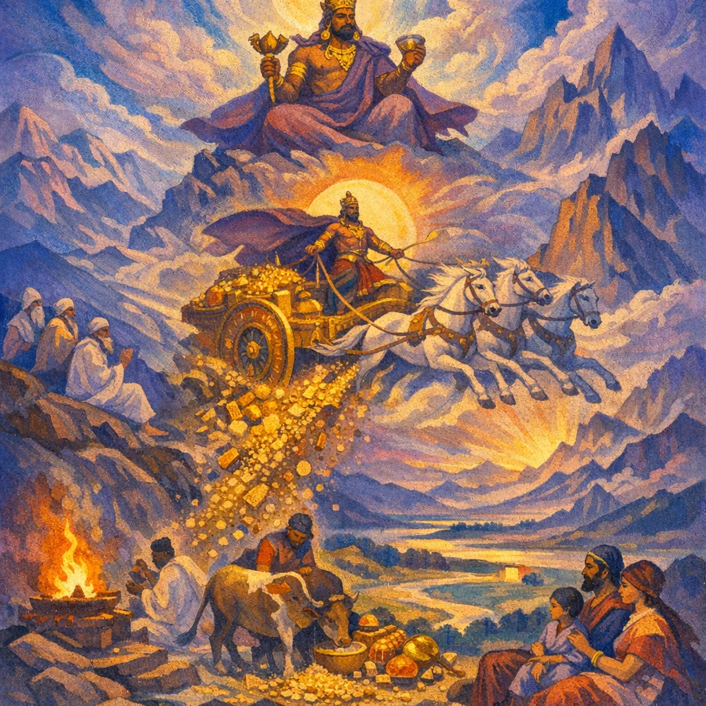 This hymn praises Indra as the Soma-empowered lord who establishes his seat in the “higher heaven,” answers the sacrificer, and brings light, wealth, and victory. It links right praise (brahman) and pressing of Soma with Indra’s tangible gifts—Sun-like illumination, hidden riches, and an undiminished share (bhaga) for the singers. The closing prayer asks that generous Dakṣiṇā be “milked out” for the priestly community so they may speak the Vast (bṛhat) in the assembly with strong progeny and heroic power.