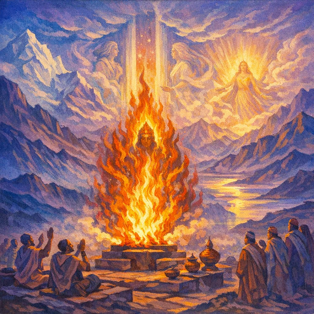 The hymn praises Agni, especially as Jātavedas—Agni who “knows all births” and acts as the priest (Hotṛ) carrying offerings to the gods.