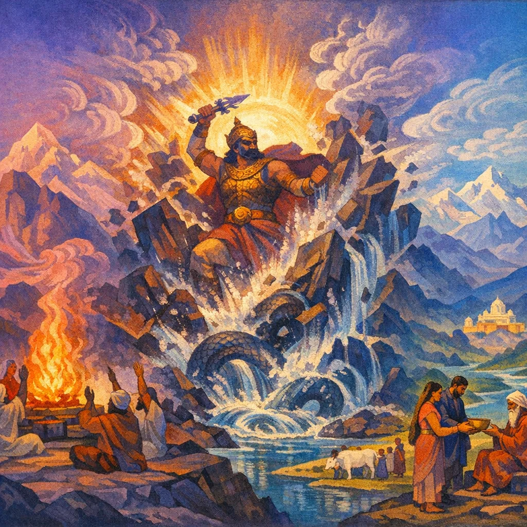 He, Indra the slayer of Vṛtra, the breaker of strongholds, drove apart the Dāsī powers that dwell in darkness. He brought forth for Manu the fields and the waters, and continually impelled the praise of the sacrificer.