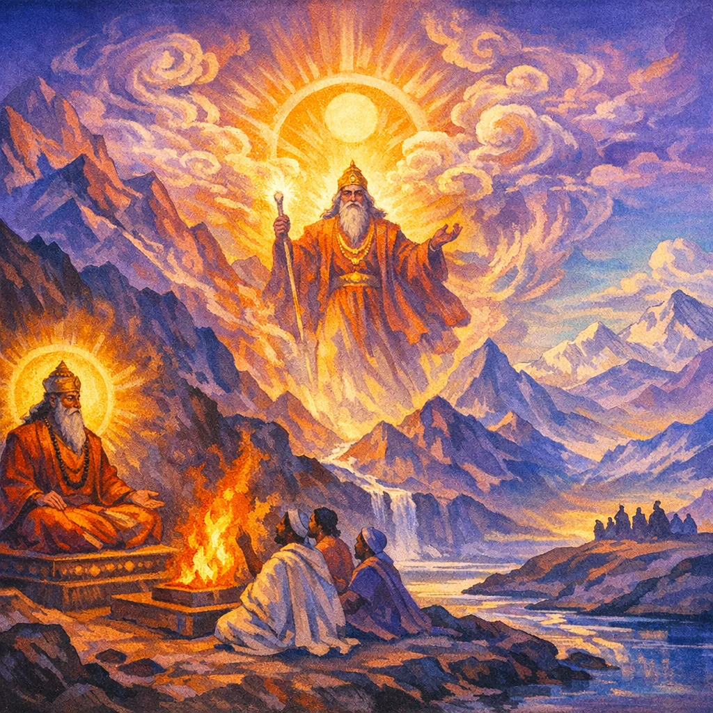 Even the gods, O luminous Lord, the far-seeing in consciousness, have attained their sacrificial portion through you. Like the sun with the great light of the dawn-cows, you are indeed the begetter of all the mantras—source of the creative Word in every power.