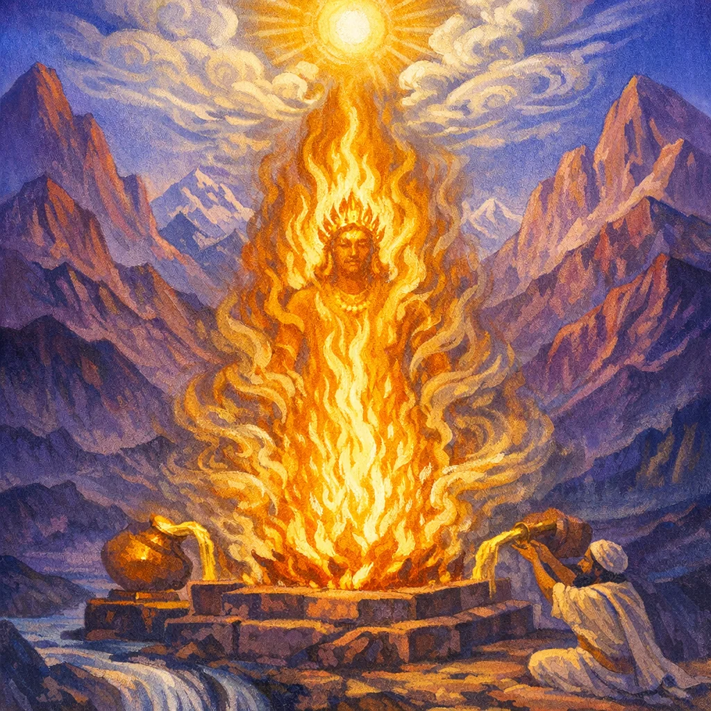 This hymn enthrones Agni as the kindled, earth-set Hotṛ who faces all the worlds and conducts the gods to the sacrifice. It praises his purifying, luminous intelligence and his role as the carrier of offerings—especially ghee—so the rite may be rightly formed and fruitful for the sacrificer.