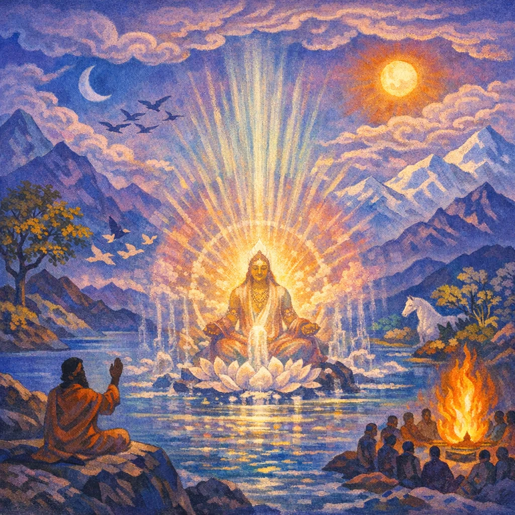 The Veda uses this as a sacred image: creative heat and light can be concealed in the depths and then emerge as life and insight. It also connects watery fertility with the fire-principle that shapes and perfects forms.