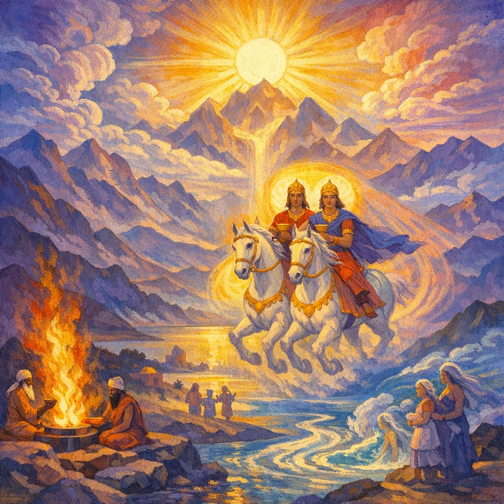 The Aśvins are twin divine helpers—swift riders associated with dawn—praised as healers, rescuers, and guides who quickly respond to human prayers and offerings.