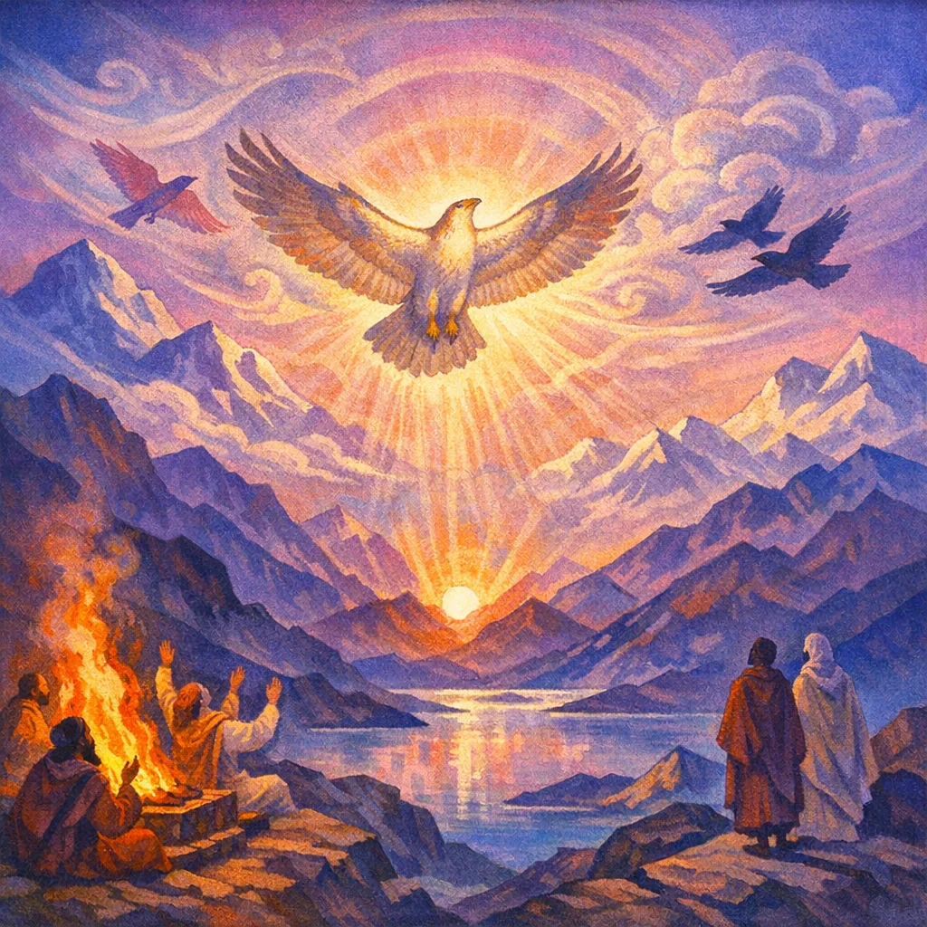 This brief hymn addresses the Śakuni/Śakunta (omen-bird) as a truthful speaker aligned with ṛta, whose calls are read as meaningful signs in ritual and daily life. The poet praises the bird’s “twofold voice” as if it were a trained chanter, and repeatedly petitions it to utter auspicious, purifying speech from every direction. The sukta thus sacralizes omen-hearing: sound in nature becomes a channel for blessing, right understanding (sumati), and success in the assembly.