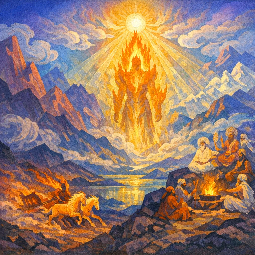 This short hymn to Agni praises his swift “yokes and chariots”—his powers of rapid approach and effective action in the sacrifice—and celebrates his radiant, heaven-like brilliance that surrounds the worshipper with imperishable light. It culminates in a communal prayer for protection and victory in conflict through the allied helps of Agni together with Indra, Soma, and the other gods.