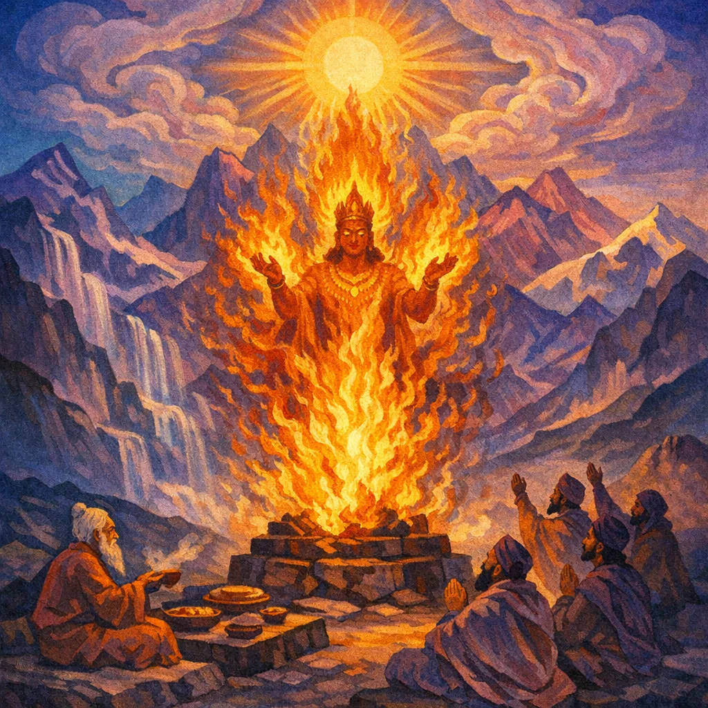 This hymn praises Agni as the sovereign king among the peoples and the indispensable Hotṛ who makes the sacrifice whole. It emphasizes that both seers and ordinary mortals kindle him in the rite, and that he bears the inspired “lights” (jyotīṃṣi) of the vipras, carrying offerings to the gods and increasing human strength and capacity.