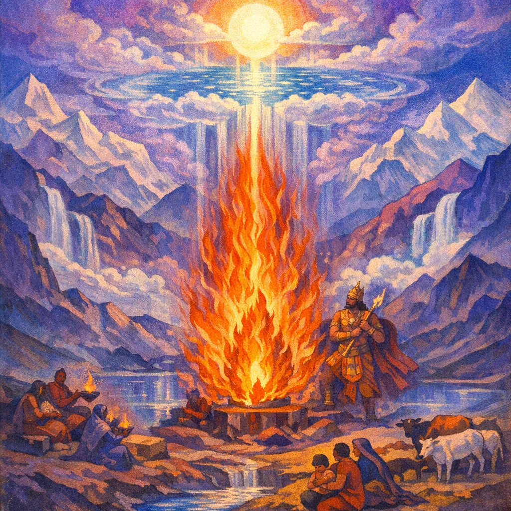 This brief Agni hymn presents the sacrificial Fire as the divine vessel in whom Indra places and enjoys the pressed Soma, making Agni the shared center of offering and victory. It expands Agni’s reach from earth to the “flood of heaven,” calling the gods to their seats of power and invoking supporting Waters for the movement of light. The sukta concludes with a prayer for Iḷā-inspired insight, enduring gain of the “cows/rays,” and prosperity of lineage through Agni’s kindly favor.