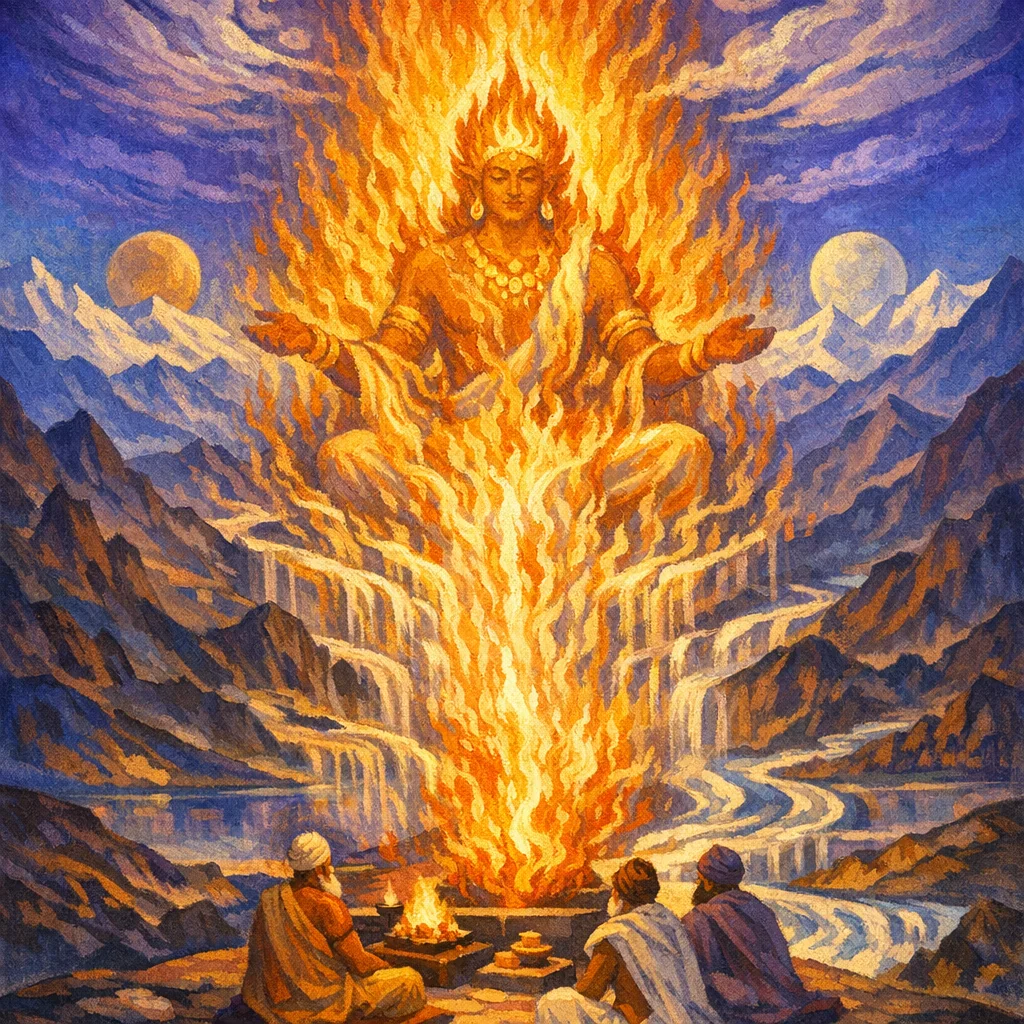I am Agni by birth, the knower of all becomings. Clarified light is my seeing, and the deathless is my dwelling. I am the hymn as the threefold-founded measure, spanning the mid-worlds; I am the unceasing heat of tapas—by name I am the offering.