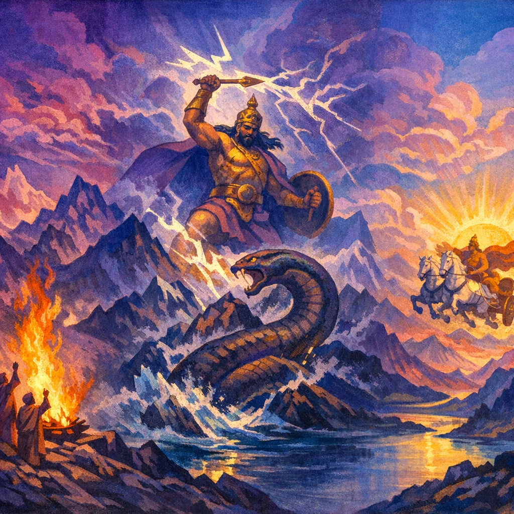 RV 3.37 is a compact, forceful invocation to Indra as Vṛtra-slayer and battle-winner, urging him to turn toward the worshippers and empower their victories. The hymn repeatedly calls Indra from near and far, asking him to arrive swiftly, accept the offering, and break the obstructing powers that withhold light, waters, and progress.