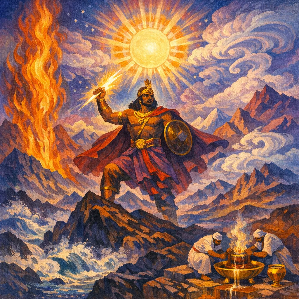 Great art thou, O mighty one, with thy manly powers—fierce, winning the riches, overpowering the others. Thou alone art king of all becoming; thou canst drive men to battle and also establish them in a secure dwelling.
